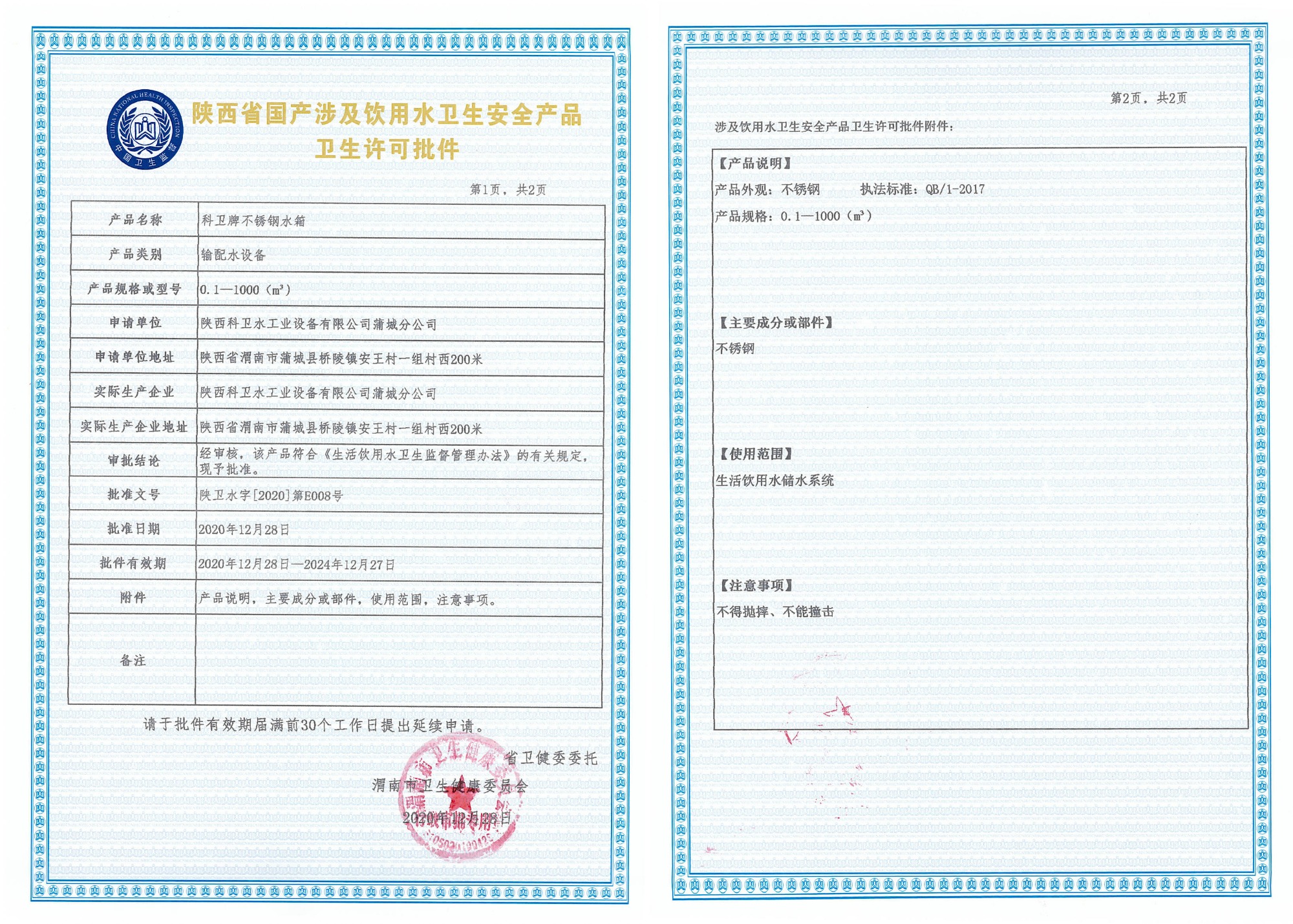 不銹鋼水箱衛(wèi)生許可批件